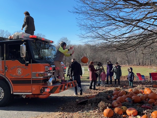 With a few more pumpkins to compost before the Fall is done, Sleepy Hollow Mayor Martin Rutyna drove the firetruck over, and students did the stomping, catapulting, and slingshot! We discussed how pumpkins thrown in the trash turn into greenhouse gas, but when you compost your pumpkin you create food for plants and animals (we’ve already seen some enjoying our pumpkins). Make sure you check out the cycle of decomposition in action next time you’re at Peabody–the pumpkin recycling patch is at the far end of the parking lot!