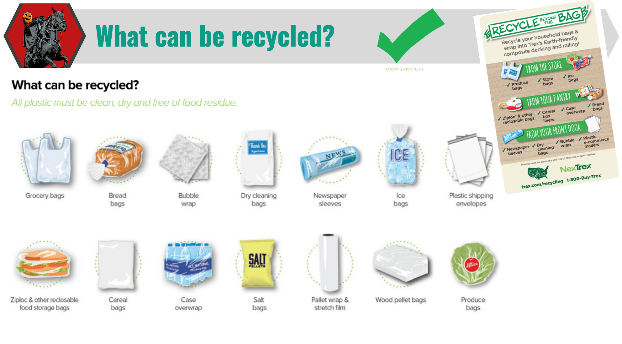 Speaking of Wasteless Horsemen, the high school is collecting plastic film (which we can’t recycle in home bins for curbside pickup) for the Trex Buddy Bench Recycling Challenge. If you or someone you know have plastic film to donate, please click here to review what can and cannot be included, as well as drop off locations.