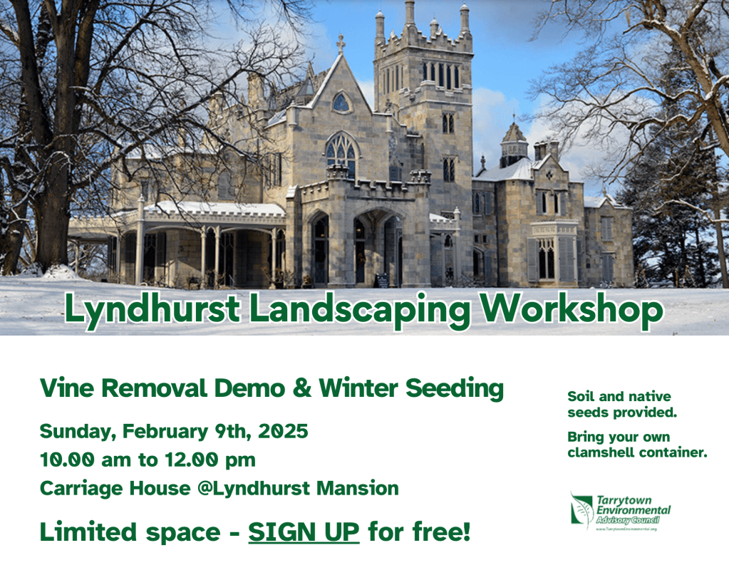Tarrytown Environmental Advisory Council (TEAC) is partnering with Lyndhurst for a winter seed sowing workshop and invasive vine removal demo. It’s a great opportunity to experience the beauty of the winter landscape at Lyndhurst, get advice from their horticulturist and sow some native seeds to take home. Sign up here!