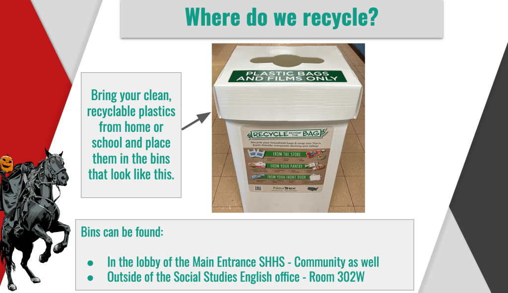 Good news is, Sleepy Hollow High School is collecting plastic film for the Trex Buddy Bench Recycling Challenge. If you or someone you know have plastic film to donate, please click here to review what can and cannot be included, as well as drop off locations.