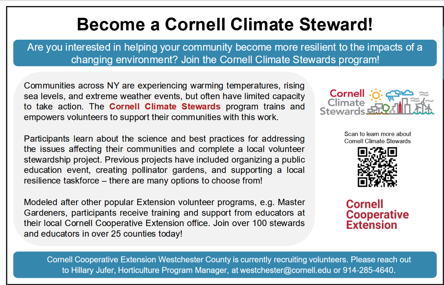The Cornell Cooperative Extension of Westchester County is planning for its first ever certified Climate Steward program starting in September 2025! This 10-module training will prepare participants to act as community leaders, addressing climate change through educational outreach and mitigation projects.