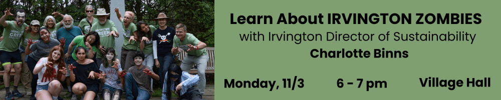 Join us before our November monthly meeting in Village Hall at 6 pm to hear Irvington’s Director of Sustainability Charlotte Binns discuss Irvington Zombies, a community resiliency initiative that prepares neighborhoods for climate emergencies.