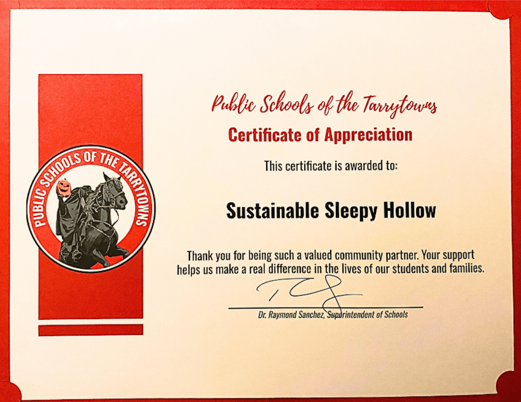 Sustainable Sleepy Hollow (SSH) was honored to be recognized as a community partner by the Public Schools of the Tarrytowns (TUFSD) at the November 20 meeting of the TUFSD Board of Education. While the Certificate of Appreciation cited SSH as a valued TUFSD community partner, the reality is that SSH could not fulfill our mission without TUFSD. The shared vision and support of students, families and TUFSD professionals propels SSH in our mission to create a more sustainable, healthy and resilient community for all village residents. SSH Student Liaison Adanhyr Morocho and SSH member and TUSFD Environmental Education Consultant Kiko Bourne are examples of the close ties between SSH and TUFSD. We also team up on the April Green Horsemen Family Saturday/Earth Month Festival, the Sleepy Hollow Oyster Count and more. SSH thanks TUFSD for this honor and looks forward to continuing our impactful partnership.