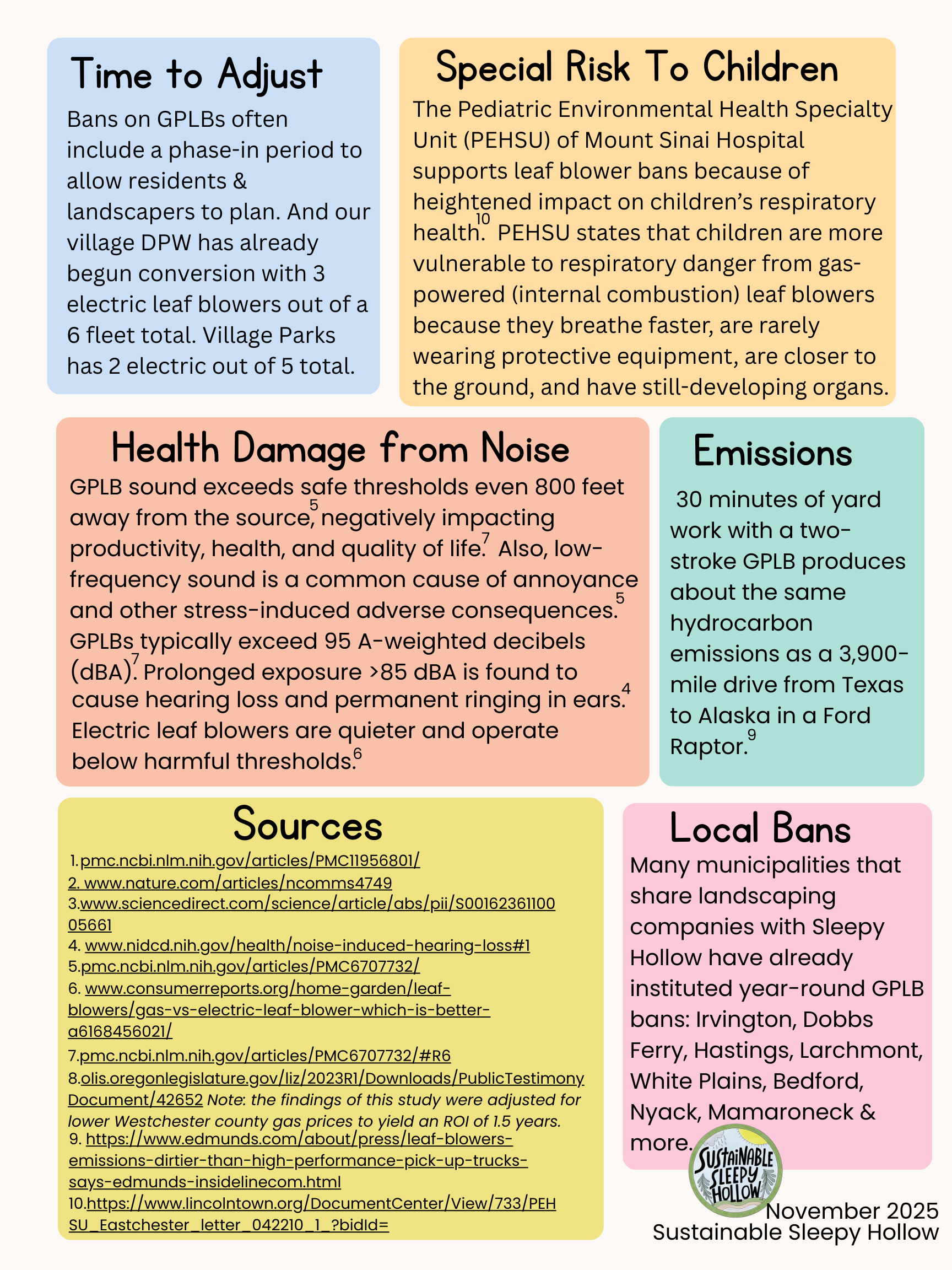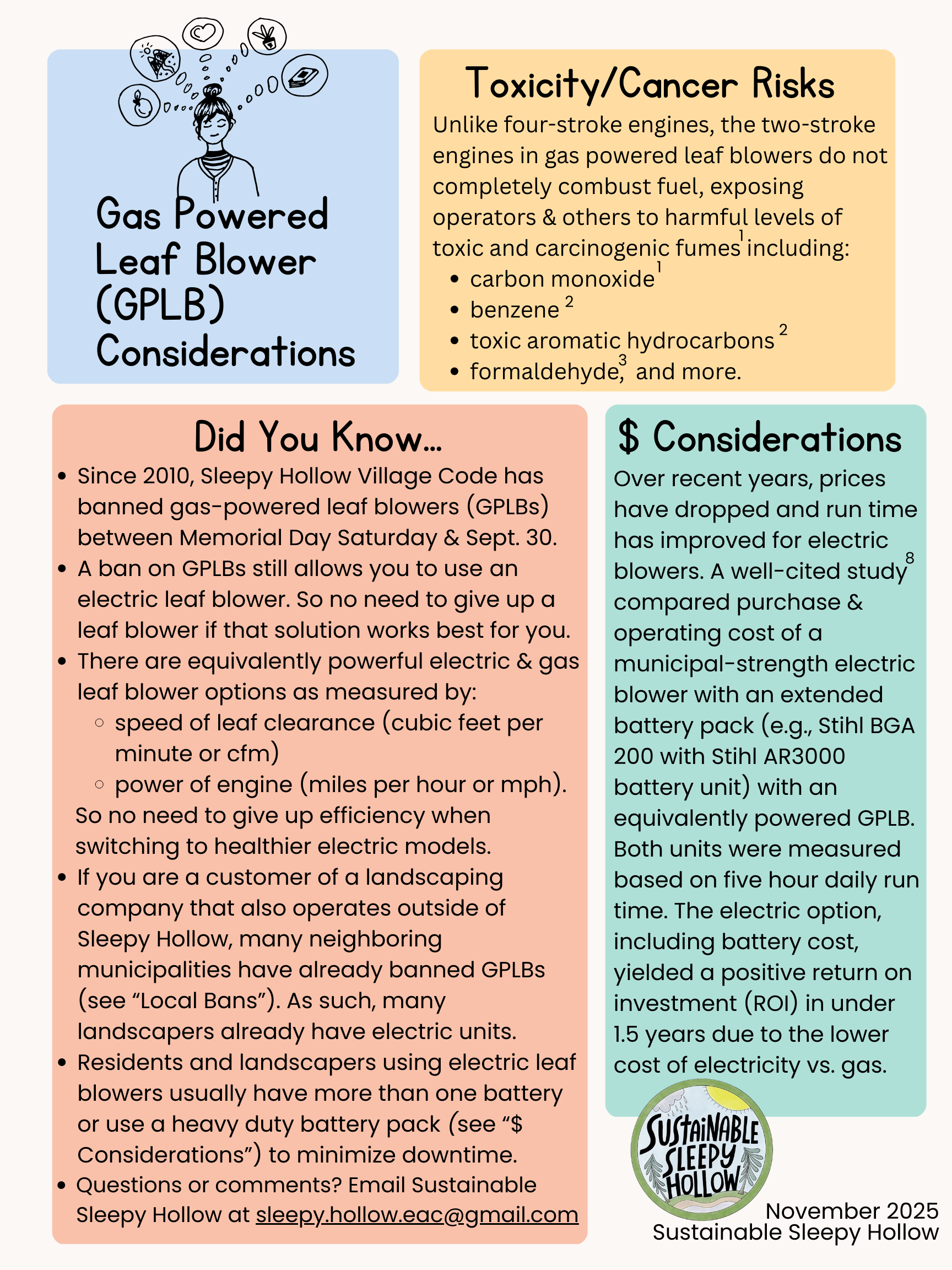 Sustainable Sleepy Hollow has been meeting with neighborhood groups, landscapers, and garden groups to share recent research on the effects of gas powered leaf blowers (GPLBs), and new findings about options for switching to electric without sacrificing power/ROI. We want to hear from you so we can make a recommendation to the village Trustees that reflect the priorities of Sleepy Hollow residents.
