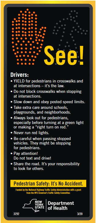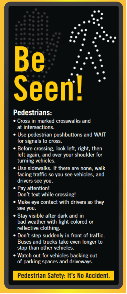 Now that it gets dark outside early, pedestrians are especially vulnerable in traffic. Reflective strips on your clothes are very effective for alerting a driver to your presence in the dark. Or use the flashlight app on your phone 🔦