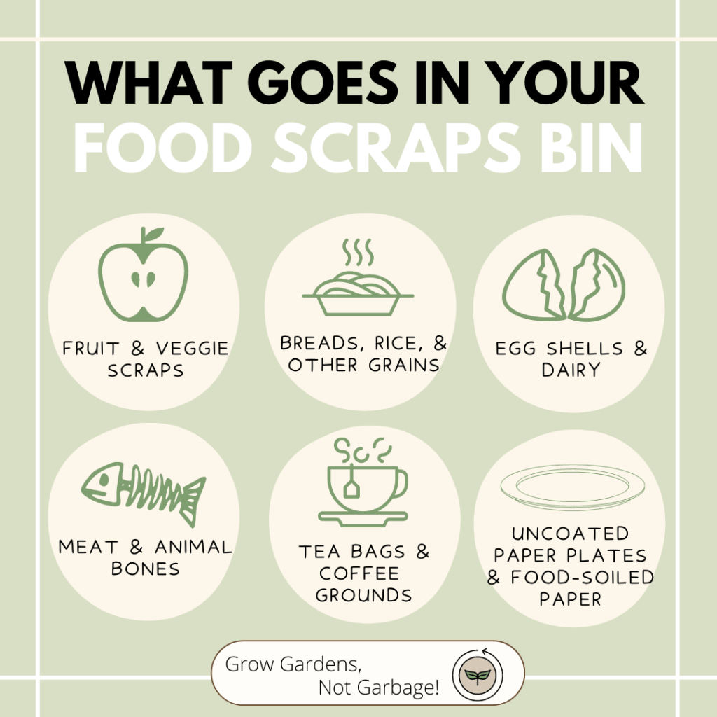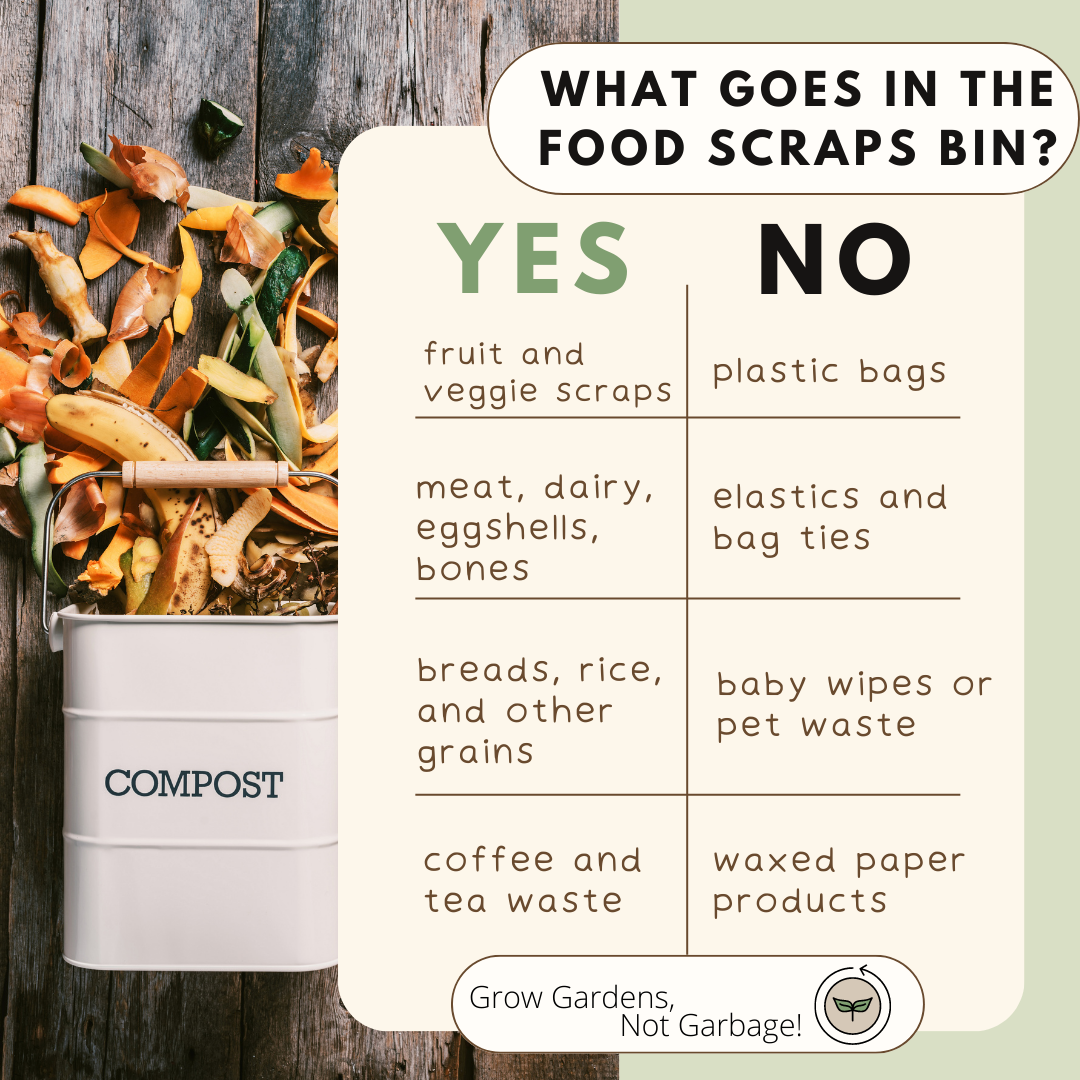 The good news is that ALL FOOD, including waste from paper tea bags, coffee grounds, and meat or fish bones, can be composted by the Village! Just make sure to remove staples, stickers, or rubber bands before tossing them in. It’s up to you whether you use a compostable liner for your bins, or if you prefer to skip them, just rinse your bin as needed. And make sure you never add a plastic or Ziploc bag directly to the Village’s food waste collection bins. Plastic of any kind is definitely not invited to the party!