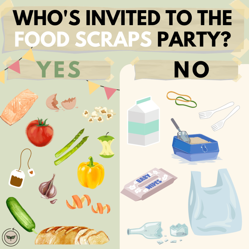 As fun as the food scrap recycling party may be, not everything from our kitchens is invited into the compost bin. For example, a few kitchen items NOT welcome to the party are the things you place in your comingled recycling bin, like plastic, glass, or metal containers. These materials do not biodegrade and will contaminate the compost.