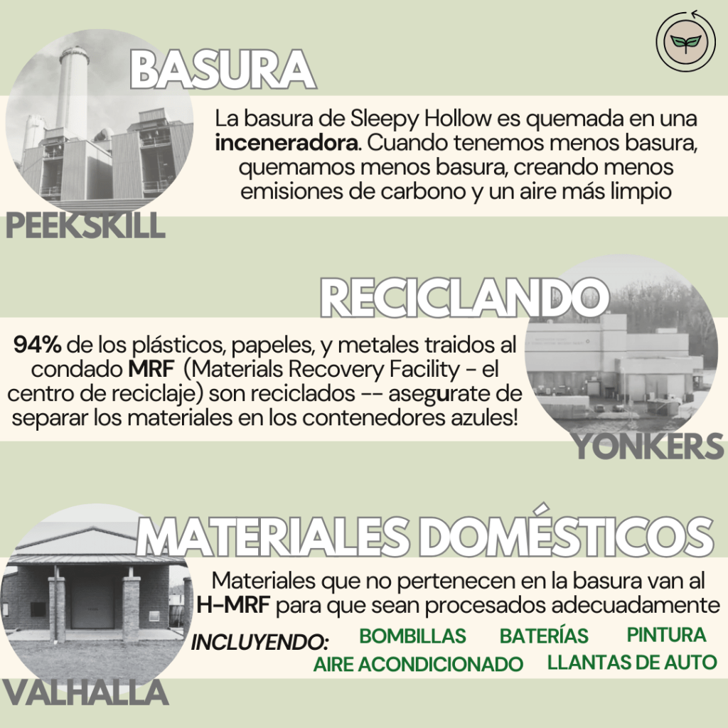 La basura en Westchester termina en diferentes lugares, dependiendo de cómo Ud. la deseche. En primer lugar, ¿nuestras bolsas de basura estándar recogidas por la Villa? Viajan hasta Peekskill, donde la basura del interior se quema en un incinerador de conversión de residuos en energía. Quemar nuestra basura contamina el aire y es uno de los mayores generadores de CO2 de nuestro condado, por lo que todos debemos colaborar para reducir la cantidad de basura que enviamos para allá. Sleepy Hollow solo recicla alrededor del 35% de nuestros desechos (¡el resto del condado lo hace en un promedio de alrededor del 50%!), por lo que tenemos mucho trabajo por delante. Por suerte, tenemos otras opciones.