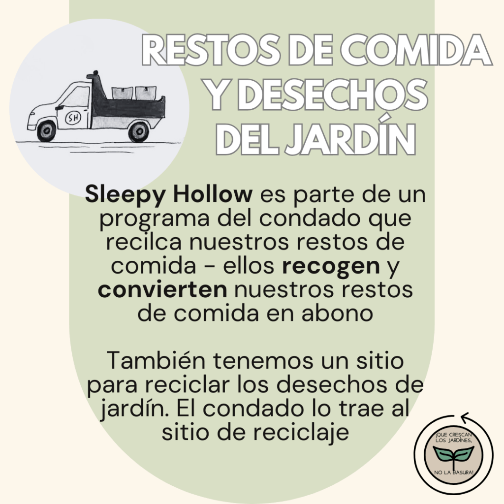- DESECHOS DE ALIMENTOS: El reciclaje de desechos de alimentos (restos de comida) pasa por un proceso diferente. Después de que nuestra Villa recolecta los desechos de alimentos, el condado se encarga de procesarlos en abono (compost) rico en nutrientes. El desperdicio de alimentos hace que el incinerador funcione de manera menos eficiente, lo que enlentece el proceso y usa más energía, ¡por eso queremos que haga crecer jardines con sus sobras, no haga crecer la pila de basura! Los desechos del jardín (como las hojas) se recolectan en el vertedero de desechos orgánicos de jardín de la Villa, y el condado también se encarga de procesarlos.